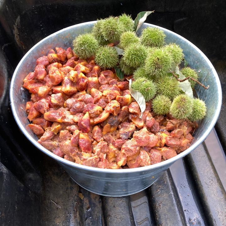 “These are seeds from native trees that we encounter in our work and everyday life,” says ALCS’s Josh First. “Almost all of the chestnut burrs we collect come from trees either in public spaces or on private property open to the public. The apple cores come from my own family’s consumption of apples, especially in the late summer and early Fall, when we process large quantities of apples into dried fruit and applesauce. Just like the chestnut burrs, the walnuts come from any walnut tree source that drops its seeds where I can easily pick them up, or where friends bring them to me. Our black walnut seeds are probably the most diversely sourced from across central Pennsylvania.”